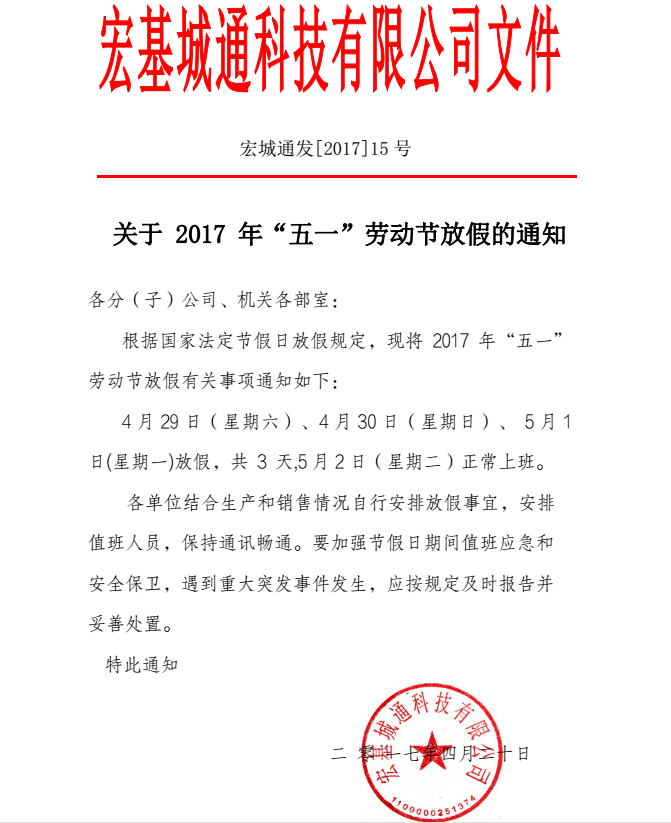 關于2017年“五一”勞動節放假的通知