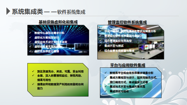 我公司一直結合信息產業的發展趨勢和自身業務的優勢,將公司戰略聚焦于IT服務、系統集成等領域,致力于打造一條完整而強大的“系統集成”產業鏈,向云計算、移動互聯網和大數據處理等信息技術行業應用領域 全面深入,成為集 現代信息系統研發、建設、運營、維護于一體的全產業鏈服務提供商。目前,公司的核心業務基本覆蓋IT服務的重要領域:硬件方面能提供智能網絡設備、存儲系統、全系列服務器等為主的先進設備。軟件方面提供從桌面端到移動端的應用軟件解決方案。技術服務方面涵蓋技術咨詢、基礎設施解決方案和支持服務。我公司有能力為任何大型客戶的信息化需求提供完整、領先的IT集成服務。服務的內容具體包括硬件系統集成服務、軟件系統集成服務和云計算環境集成服務。